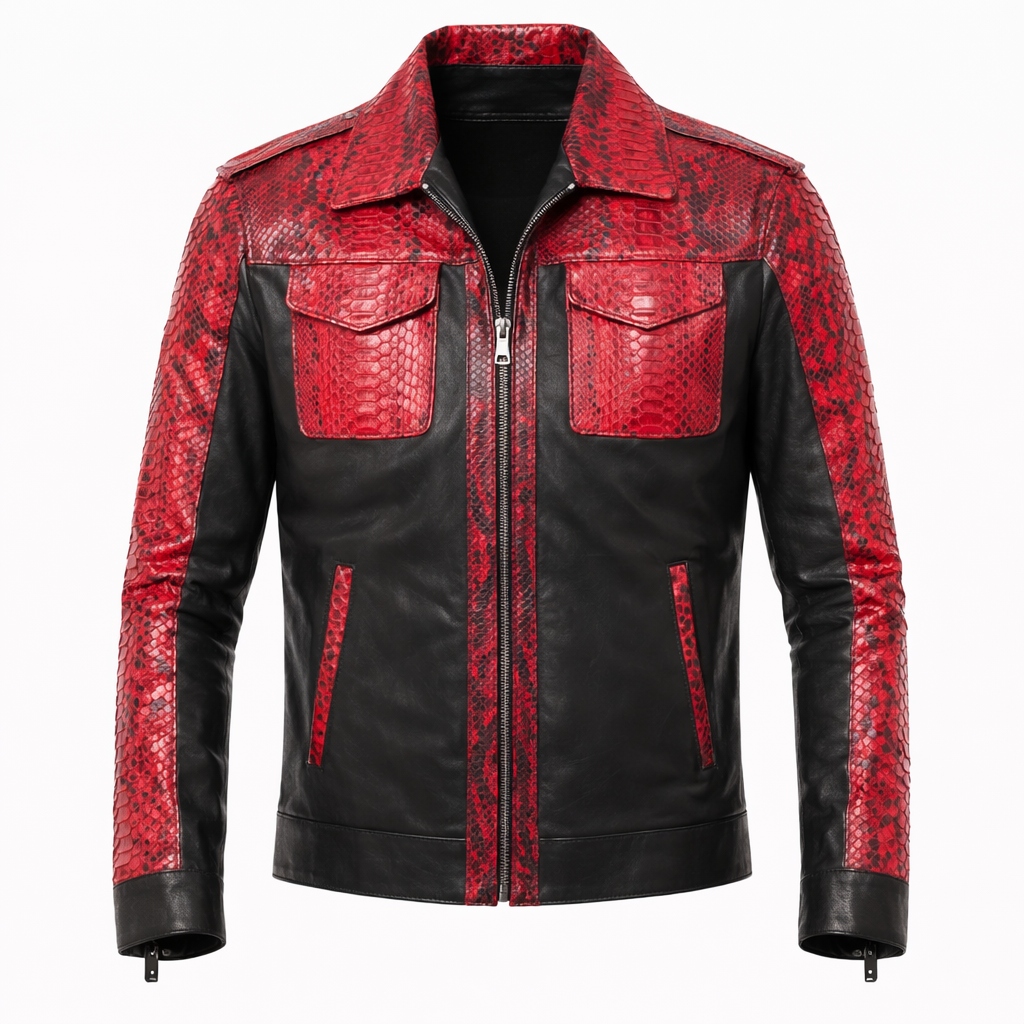 Bold, edgy, and fashion-forward: this snakeskin leather jacket is designed for men who want to make a statement in street style.